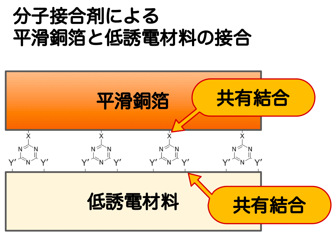 分子接合では、接着力を化学的な結合によって得るため、従来の接着のように分子間力やアンカー効果に頼る必要はありません。さらに、この分子接合剤の官能基Yには、極性が小さい低誘電樹脂とも安定的に化学結合できるものがあります。これにより、分子接合技術を活用することで、「平滑な銅箔」と「低誘電樹脂」の接着が可能になるのです。