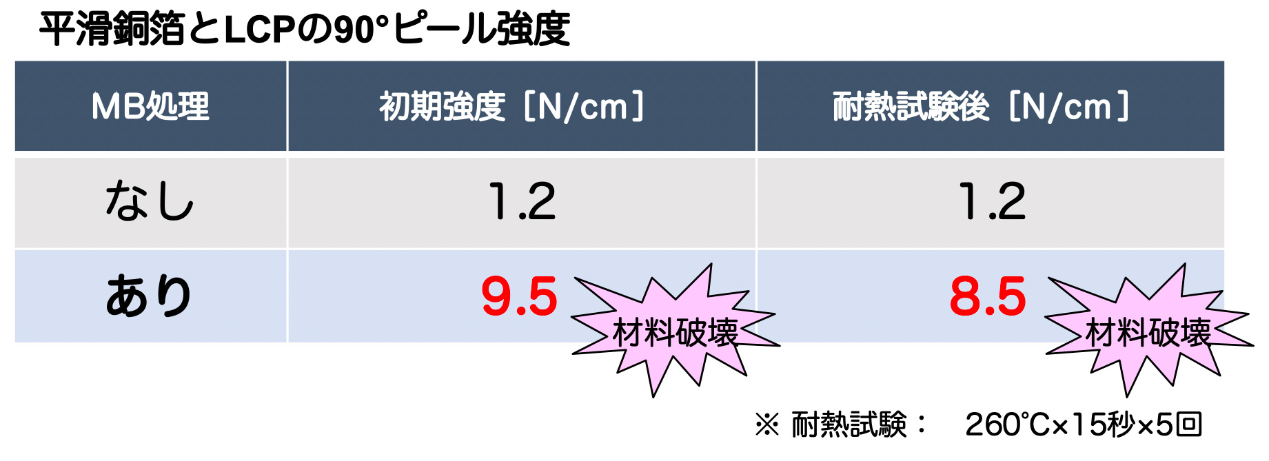 この結果は、分子接合技術で接合した平滑銅箔とLCPが、高周波対応FPCに必要な「低誘電性」と「平滑な銅箔」という要求を満たしつつ、実用的な「接着強度」と「耐熱性」を同時に実現したことを表しています。