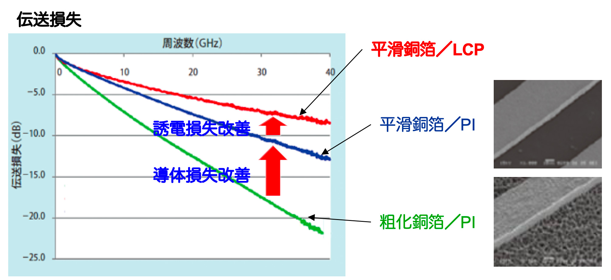 高周波対応FPCの伝送損失の測定例を、下の図に示しました。分子接合技術によって作製したLCPと平滑銅箔のFPCは、導体損失と誘電損失が改善され、伝送特性が向上しました。
